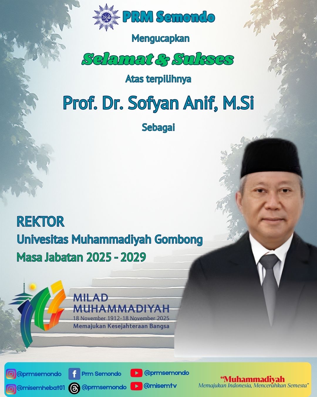 Read More →: Selamat & Sukses atas dilantiknya Rektor baru UNIMUGOBismillah.Selamat dan Sukses atas terpilihnya Prof. Dr. Sofyan Anif, M.Si sebagai Rektor Universitas Muhammadiyah Gombong Masa Jabatan 2025-2029.